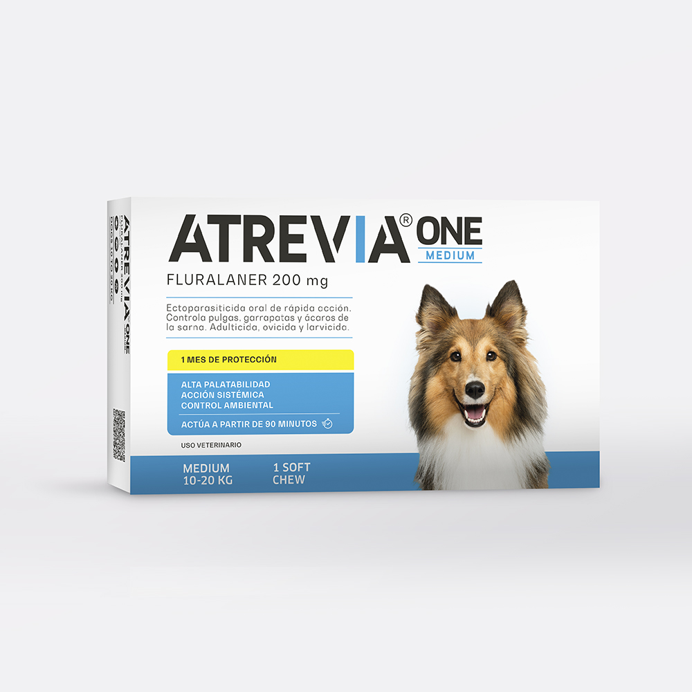 Atrevia® One Medium otorga un efectivo tratamiento ectoparasitario sistémico contra pulgas, garrapatas y ácaros, en base a fluralaner, que protege a los perros por lo menos por 30 días. Puede utilizarse en animales infestados o como preventivo. Empieza su acción en 90 minutos y mata a las pulgas en 8 horas y a las garrapatas en 12 horas.