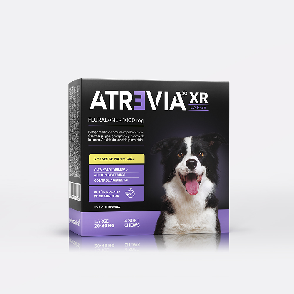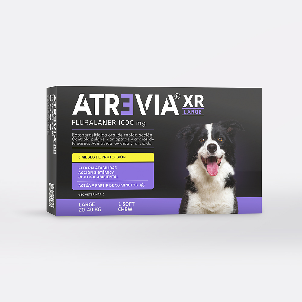 Atrevia® XR Large otorga un efectivo tratamiento ectoparasitario sistémico contra pulgas, garrapatas y ácaros, en base a fluralaner, que protege a los perros por 3 meses. Puede utilizarse en animales infestados o como preventivo. Empieza su acción en 90 minutos y mata a las pulgas en 8 horas y a las garrapatas en 12 horas.